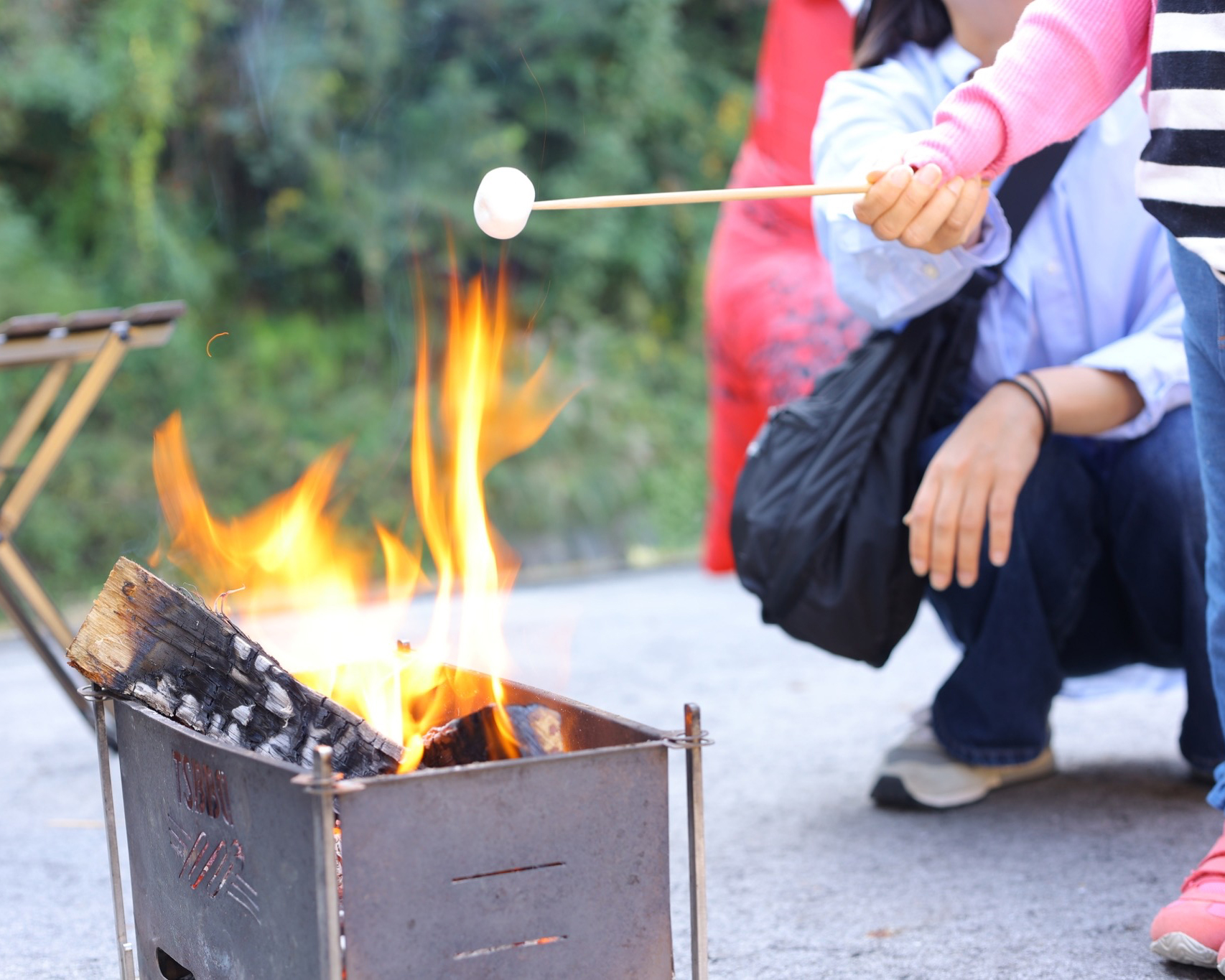 出店いただいた「村の鍛冶屋」様の焚き火台で焼きマシュマロを行う様子。