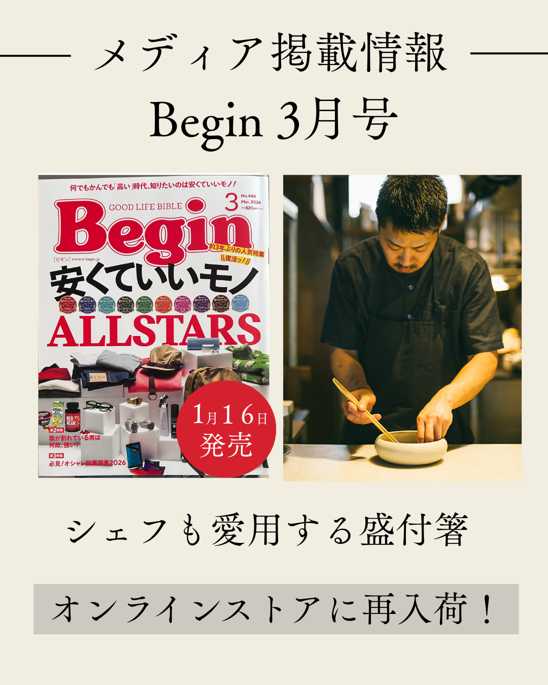 本日1月16日発売の雑誌『Begin(ビギン)』3月号に、ヤマチクの箸が掲載されました🥢